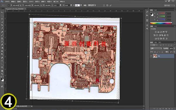 4.按Ctrl+1將圖片以實(shí)際大小顯示(或按住Alt+滑輪,盡量放大圖片),接著按Ctrl+T,使圖片進(jìn)入自由變換狀態(tài),如下圖所示,滑動(dòng)鼠標(biāo)的滑輪,調(diào)整圖片的角度,使板子邊緣與參考線平行。調(diào)整好之后,按回車鍵使調(diào)整生效。放大圖片檢查,如果板子還沒有調(diào)正的話,重復(fù)以上步驟。注意:此過程中,如果想移動(dòng)參考線,要先按Ese退出自由變換狀態(tài)才可以。移動(dòng)參考線的方法是先按V鍵將鼠標(biāo)切換到移動(dòng)工具狀態(tài),然后用鼠標(biāo)點(diǎn)住參考線拖動(dòng)即可。