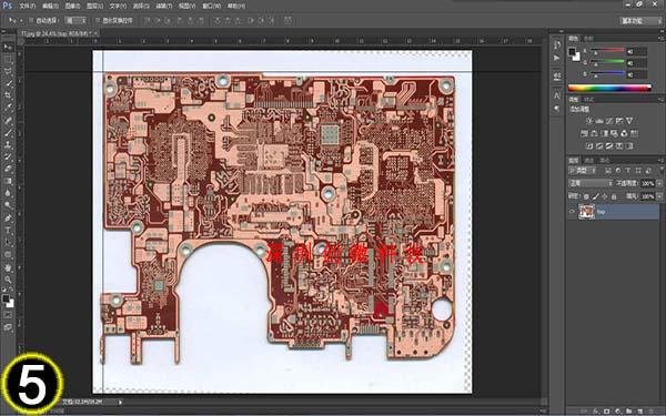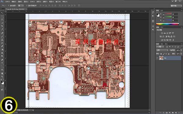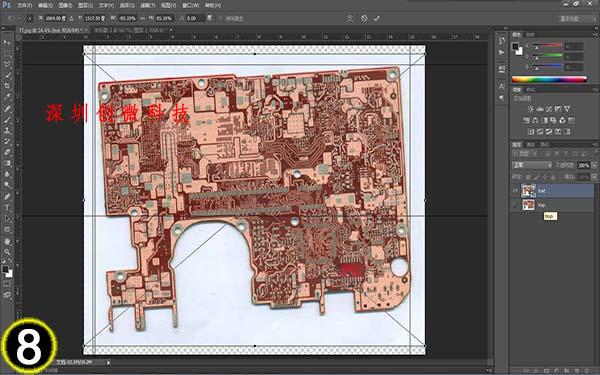 8.跟調(diào)正頂層掃描圖時(shí)一樣,按 Ctrl+T 進(jìn)入自由變換狀,按鍵盤方向鍵移動(dòng)圖層,大概對準(zhǔn)參考線,然后調(diào)正角度,使板子邊緣與參考線平行,再按鍵盤方向鍵移動(dòng)圖片對準(zhǔn)參考線。下圖為調(diào)正底層掃描圖后的效果: